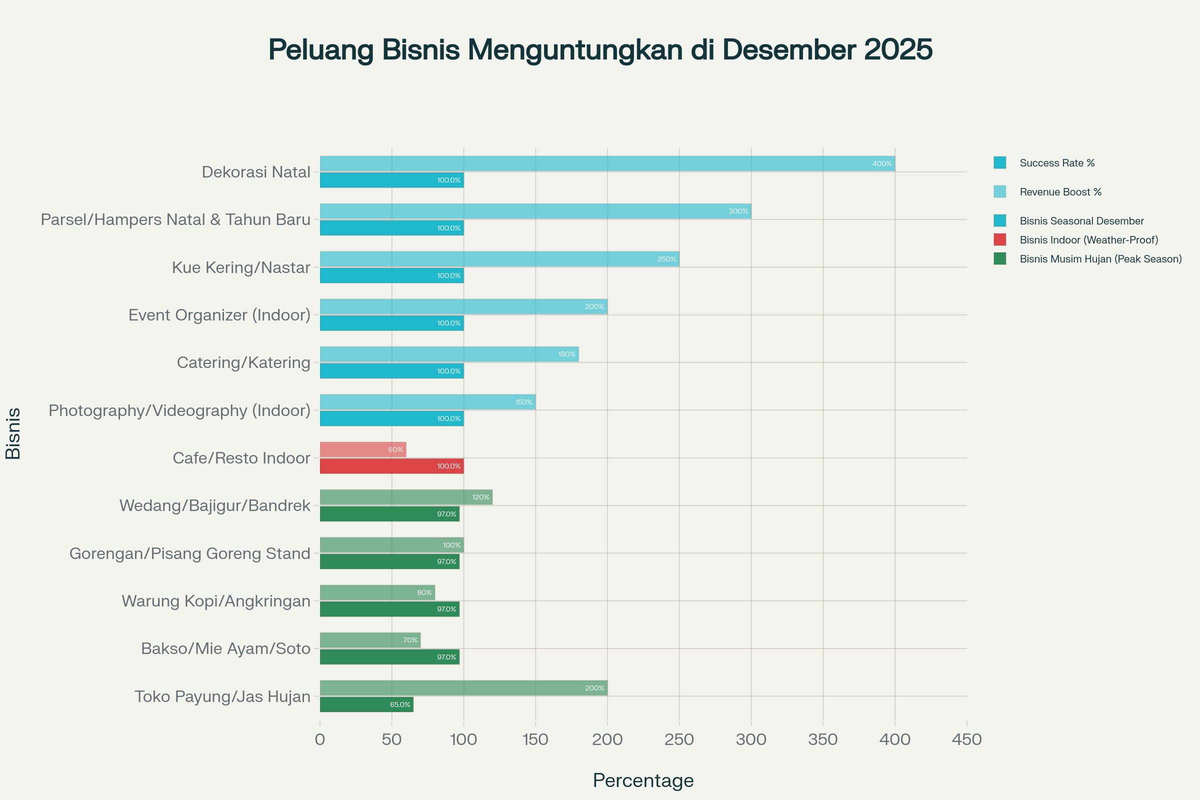 Bisnis seasonal seperti dekorasi Natal dan hampers memiliki potensi peningkatan revenue hingga 400%, diikuti bisnis musim hujan seperti payung/jas hujan (+200%). Kombinasi calendar-driven dan weather-driven demand menciptakan peluang emas di Desember.