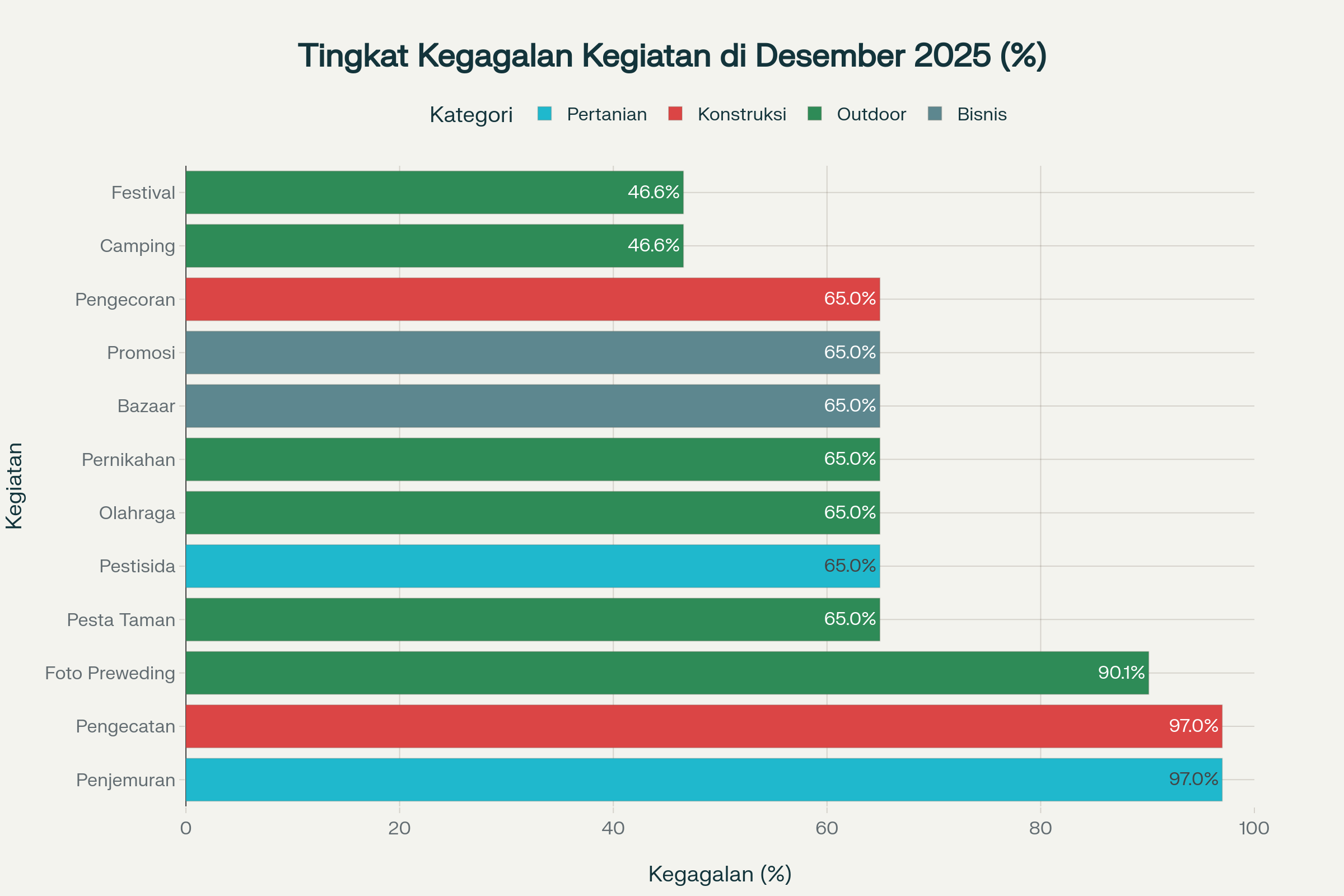Penjemuran hasil panen dan pengecatan eksterior memiliki risiko tertinggi (97%), diikuti fotografi outdoor (90%), dan event outdoor (65%). Bisnis yang memerlukan cuaca kering total hampir mustahil berhasil di Desember 2025.